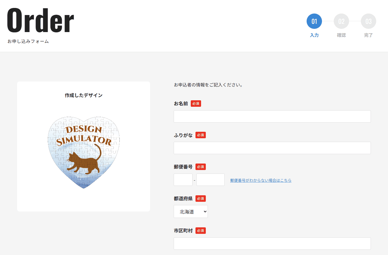 デザイン作成後に、名前や住所などを入力するフォームが表示されます。 送信すると、御社とユーザーの両方に申込内容の自動メールが届きます。 メールに記載されたキーを元に、管理画面からデザインを確認・ダウンロードできます。 フォーム付きの方式なので、貴社サイトにデザインシミュレータのURLを記載するだけで済みます。