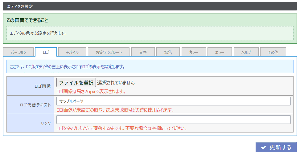 デザインシミュレータ上の文言やロゴなどを設定できる機能を備えています。また、管理画面の操作説明マニュアルも完備しています。