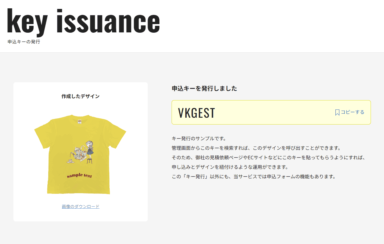 デザイン完了後に短いキーが発行される方式です。 貴社は管理画面でそのキーを検索し、対応するデザインを確認できます。 ECサイトの商品備考欄や見積フォームにキーを入力してもらうことで、デザイン付きの注文や見積依頼に利用できます。 楽天などに導入する際は、主にこの方式になります。
